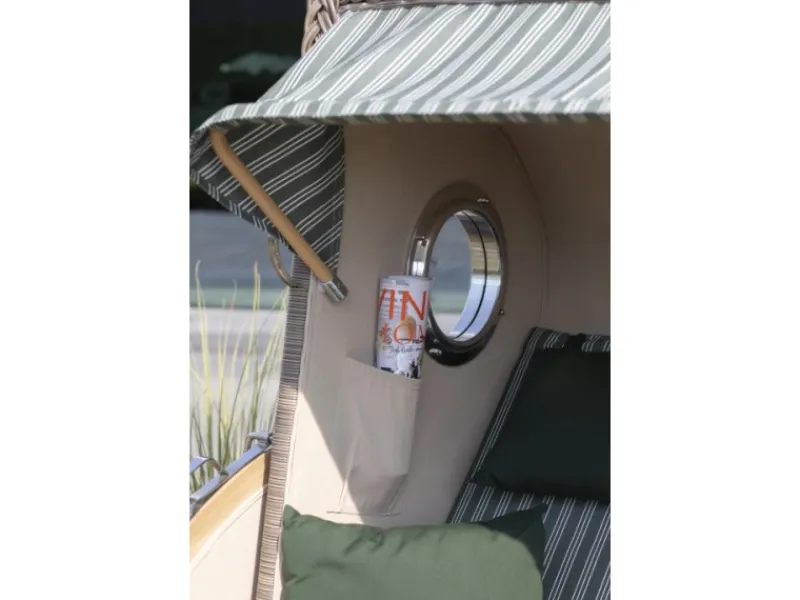 Strandkorb Rantum Teak – Maritimer Charme im eigenen Garten Der Strandkorb Rantum aus elegantem Teakholz lässt Sie mit seiner komfortablen Ausstattung den Alltag vergessen. Dicke hochwertige Polster, weiche Nackenkissen und verstellbare Fußstützen sorgen für angenehmes Sitzen. Für Freunde der besonderen Bequemlichkeit lässt er sich ganz einfach zum Volllieger umfunktionieren. Der Oberkorb ist in mehreren Stufen verstellbar, sodass Sie sich ihren Sonnensitz leicht nach Ihren Bedürfnissen gestalten können. Mit seinem Bullauge, seiner Sonnenmarkise und seinem grauen PE-Rattangeflecht verbreitet er das Urlaubsambiente, das Sie zur Entspannung brauchen. Teakholz beeindruckt zum einen durch seine elegante Ausstrahlung, zum andern durch seine praktischen stark wasserabweisenden Eigenschaften. In Verbindung mit dem hochwertigen witterungsbeständigen PE-Geflecht bildet dieser Strandkorb ein Meisterwerk, das Sie sowohl im Terrassen- und Gartenbereich, als auch innerhalb Ihres Hauses platzieren können. Hochwertiges Teakholz Der Strandkorb Rantum überzeugt durch die besonders hochwertig verarbeiteten edlen Materialien. Das massive Teakholz mit seinem warmen, hellen Farbton verleiht dem Strandkorb Rantum seinen ganz besonderen Charakter und macht ihn zu einem qualitativ hochwertigen Gartenmöbel. Teakholz ist ein besonders hochwertiges Holz und eignet sich aufgrund seiner hochwertig Eigenschaften hervorragend für Strandkörbe. Wir verwenden ausschließlich hochwertig produziertes Plantagen-Teakholz. Aufgrund seines hohen Öl- und Kautschukanteils hat Teakholz einen hochwertig Verwitterungs- und Alterungsschutz. Egal ob Sie die im Laufe der Zeit entstehende silbrig-graue Patina lieben oder den hochwertig hellen Farbton bevorzugen, der sich durch regelmäßiges Ölen des Holzes erhalten lässt – unser Teakholz überzeugt durch seine Langlebigkeit und die hochwertige Optik. Langlebiges PE-Geflecht Die aufwendig gestaltete Flechtung des Strandkorbes wird in liebevoller Handarbeit für jeden Strandkorb einzeln erstellt. Die interessante Sonnenflechtung des Seitenteils und die formschöne Einbindung des Bullauges zeugen von hohem handwerklichem Geschick und verleihen dem Strandkorb Rantum ein außergewöhnliches und einzigartiges Design. Das verwendete PE (Polyethylen)-Geflecht ist ideal für den Einsatz im Freien, denn es ist robust und temperaturbeständig, besonders auch bei hohen Temperaturschwankungen. Zudem ist die glatte Oberfläche des Geflechtes schmutz- und witterungsabweisend. Weitere Vorteile wie UV-Beständigkeit und Farbechtheit machen Ihren Strandkorb Rantum zu einem langjährigen Begleiter, an dem Sie lange Ihre Freude haben werden. Edelstahl und viele Extras Neben dem massiven Teakholz und beständigen PE-Geflecht verwenden wir für unseren Strandkorb Rantum ausschließlich hochwertige Edelstahlbeschläge aus V2A-Edelstahl. Diese Beschläge kommen bei der Befestigung der Bistrotische, der Verstärkung der unteren Ecken und beim Feststellmechanismus der Verstellgriffe zum Einsatz. Komplettiert wird der Strandkorb Rantum durch eine Vielzahl durchdachter Extras. So verfügt der Strandkorb Rantum nicht nur über eine extra-dicke Polsterung, sondern auch über farblich passende Wurfkissen und verstellbare Nackenkissen. Zeitungstaschen, integrierte Armlehnen, zwei große, schwenkbare und zudem abnehmbare Bistrotische.