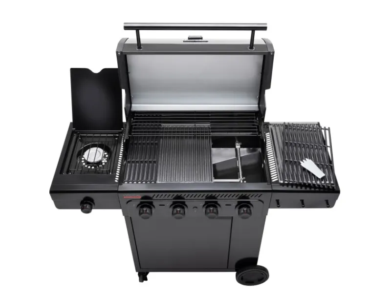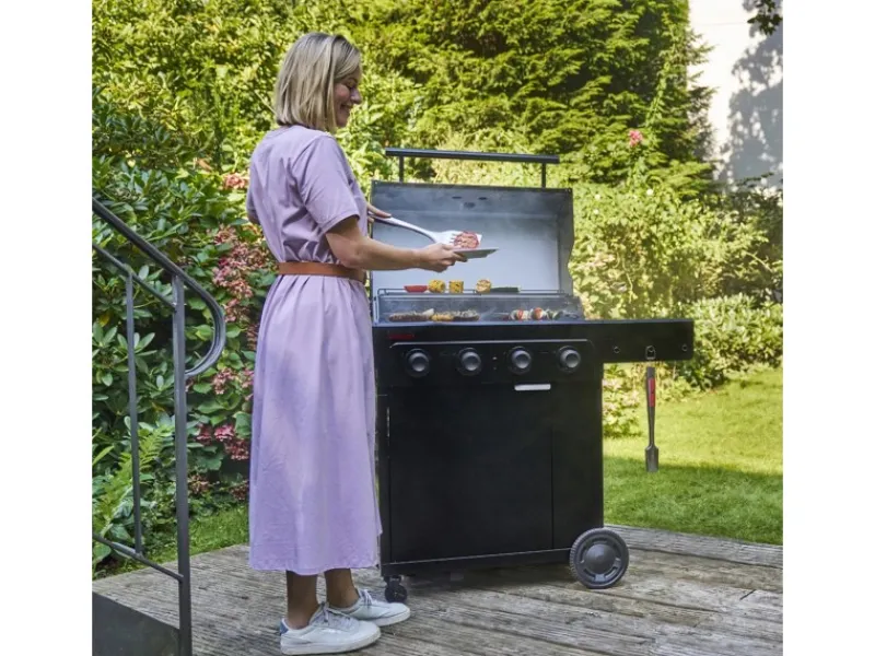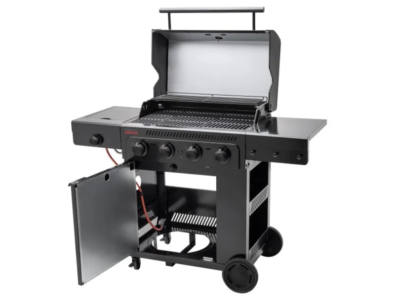 Das Gehäuse des Gasgrills besteht aus hochwertigem Edelstahl. Dadurch ist der BBQ Gasgrill schnell und einfach zu reinigen. Außerdem sind die Emitterplatten spülmaschinenfest, wodurch die Reinigung noch schneller gelingt. Der integrierte Schrank und die Seitenablage mit Haken Gear Trax bieten viel Stauraum zum Beispiel für die Gasflasche und für Zubehör. Die zusätzliche Seitenfläche kann praktisch zum Abstellen von Gewürzen, Zutaten oder Geschirr genutzt werden.