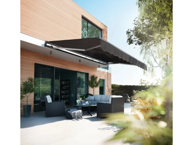 Eleganter Sonnenschutz für Terrasse oder Balkon im unifarbenen Design mit Volant