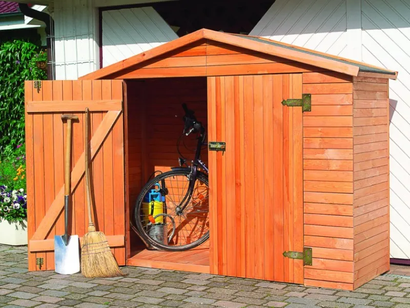 Der Geräteschrank Heidelberg ist extra breit und besonders für Fahrräder geeignet. Er ist aus massivem Kiefernholz gefertigt und wetterfest imprägniert. Das Dach ist mit Dachpappe eingedeckt. Die Materialstärke beträgt 1,6 cm. Maße: B 227 cm x T 82 cm x H 173 cm