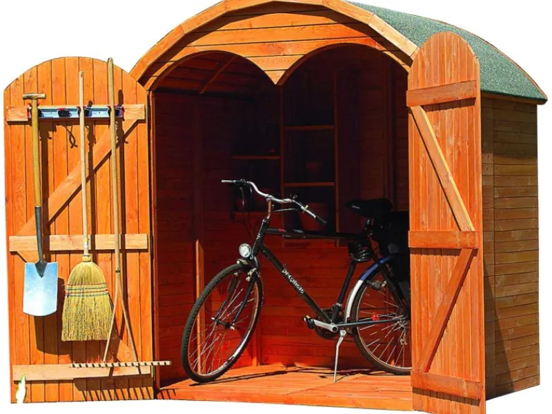 Der geräumige Geräteschrank von Promadino ist aus massivem Kiefernholz und wetterfest imprägniert. Wunderschön in seiner Optik mit den beiden abgerundeten Türen. Das Regal im Innenraum gehört mit zum Lieferumfang. Das formschöne Dach ist wetterfest mit Dachpappe eingedeckt. Die Materialstärke beträgt 1,0 cm. Für den Aufbau ist ein Fundament erforderlich. Das Innenmaß ist: Breite 180 cm x Tiefe 140 cm – Das Außenmaß: Breite 195 cm x Tiefe 148 cm x Höhe 211 cm. Gewicht ohne Verpackung: 177 kg