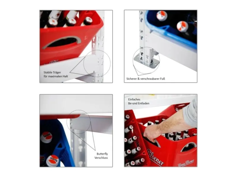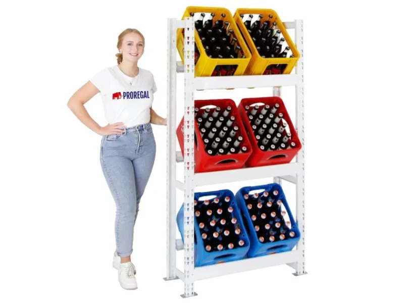 Das Getränkekistenregal Tegernsee von PROREGAL® ist ideal um im Aufenthaltsraum in der Garage oder in der Kantine die Getränkekisten aufzubewahren.Die Produktion des Regals erfolgt nach höchsten Qualitätsstandards in der EU. Die Fertigung ist nach ISO 9001 zertifiziert. Das Metall ist pulverbeschichtet um eine lange Lebensdauer sicherzustellen und entgratet um unangenehme Schnittkanten zu beseitigen.Selbstverständlich sind die Fachböden in der Höhe verstellbar und zwar in einem 38 cm Raster. Durch die flexible Einstellungen lassen sich auch andere Kisten abseits von Getränkekisten sehr praktisch lagern. Die Doppel-Profile erhöhen die Standstabilität und die Metallfüße können sogar auch praktisch mit dem Boden verschraubt werden.