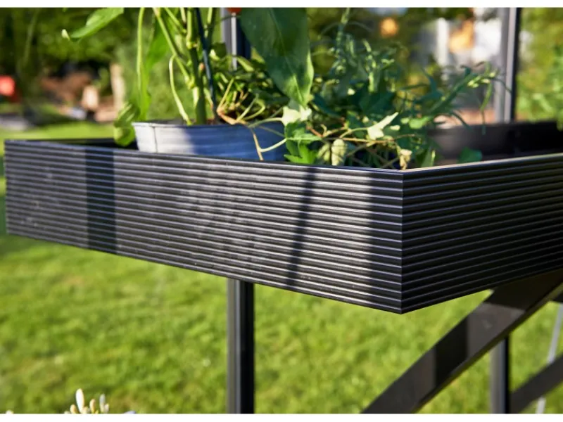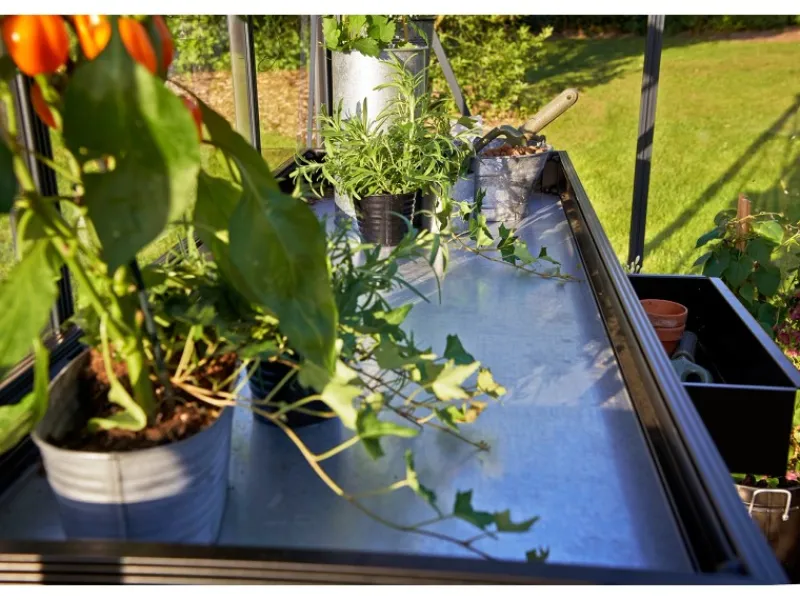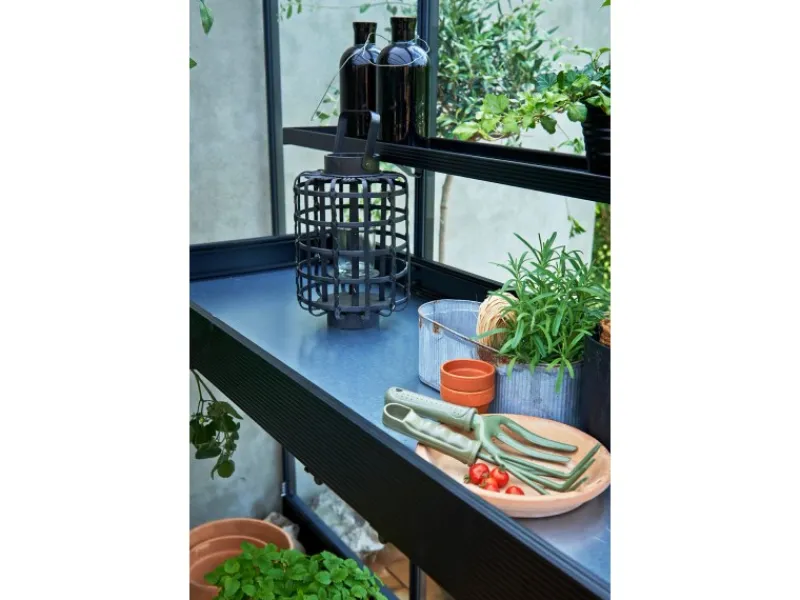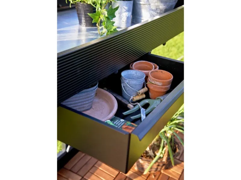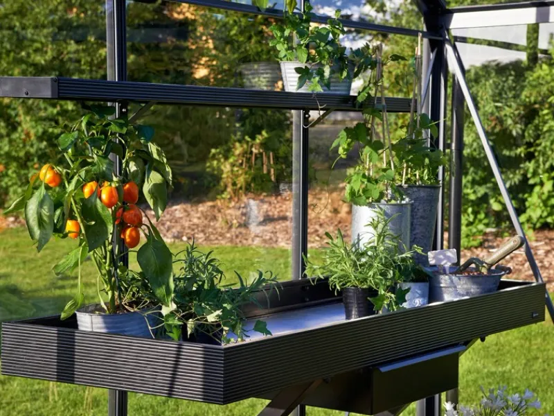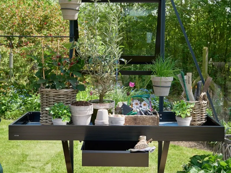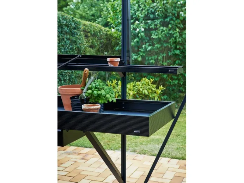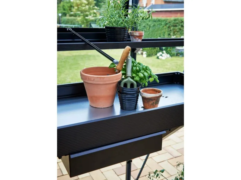 Die integrierten Gewächshaustische von Juliana bieten eine funktionelle Arbeitsfläche, die nicht zu viel Platz einnimmt. An der Unterseite des Tisches befindet sich eine Schublade zur Aufbewahrung von Werkzeug, Samen und Ähnlichem. Das schicke Design harmoniert gut mit den neuen Gewächshausserien von Juliana.