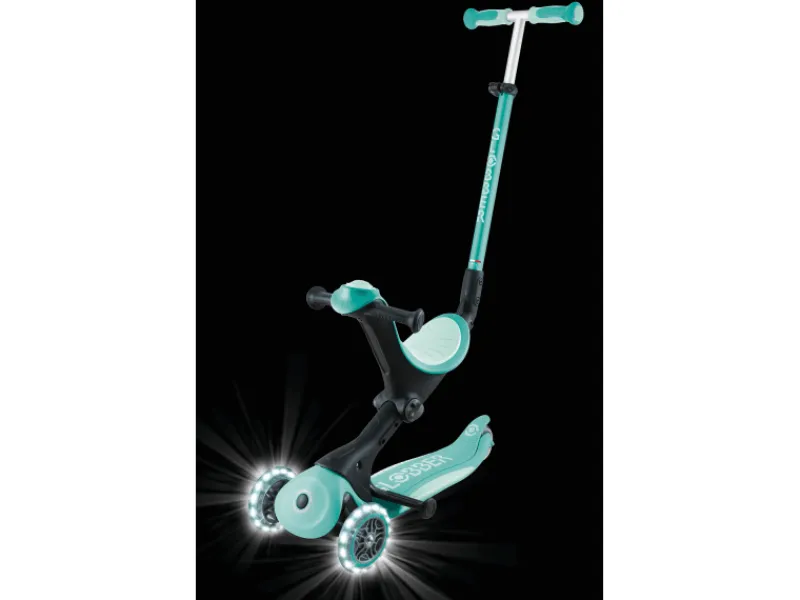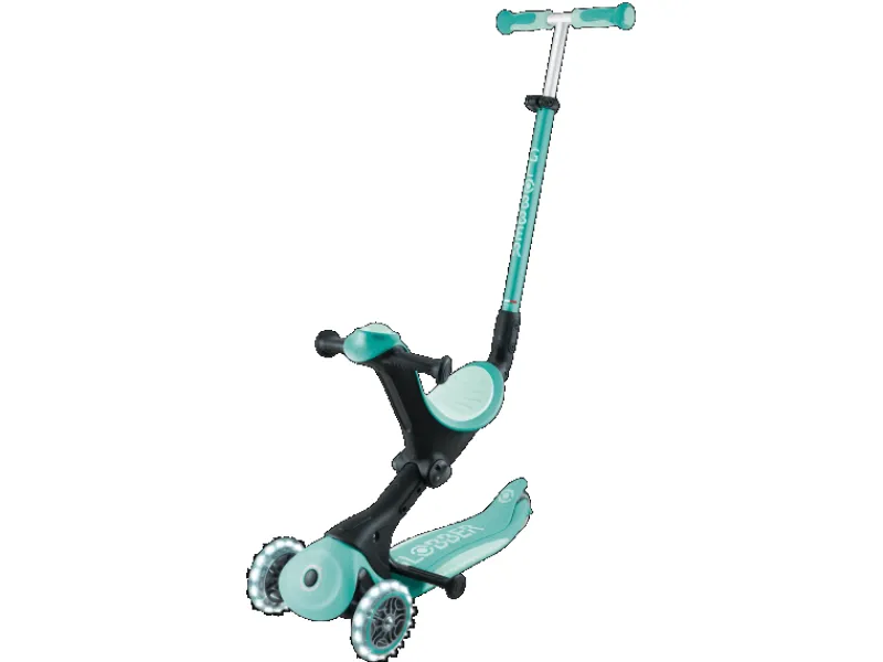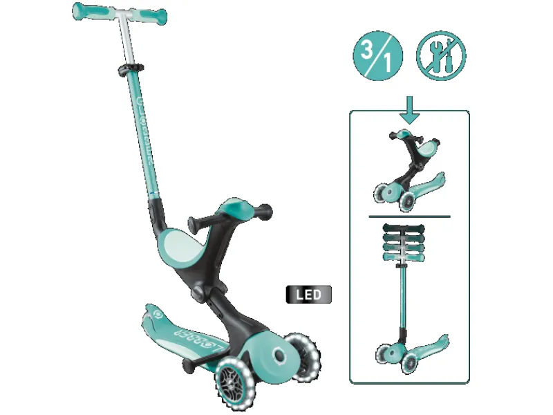 – Einfache, werkzeuglose Umbaumöglichkeit zu Dreirad mit Schubstange, Laufrad und Scooter