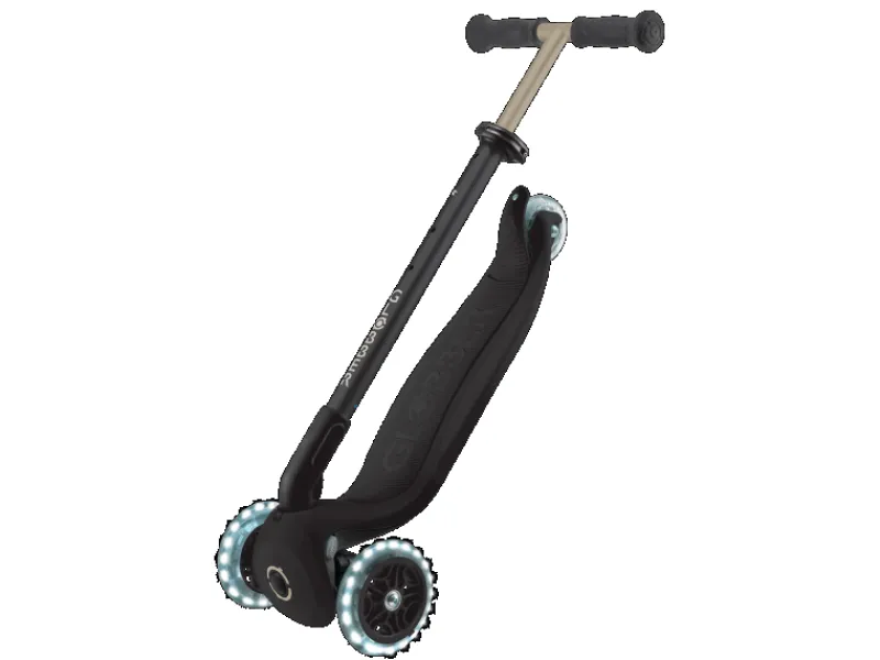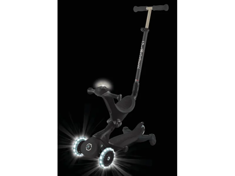 – Einfache, werkzeuglose Umbaumöglichkeit zu Aufsitzrad mit Schubstange, Laufrad und Scooter
