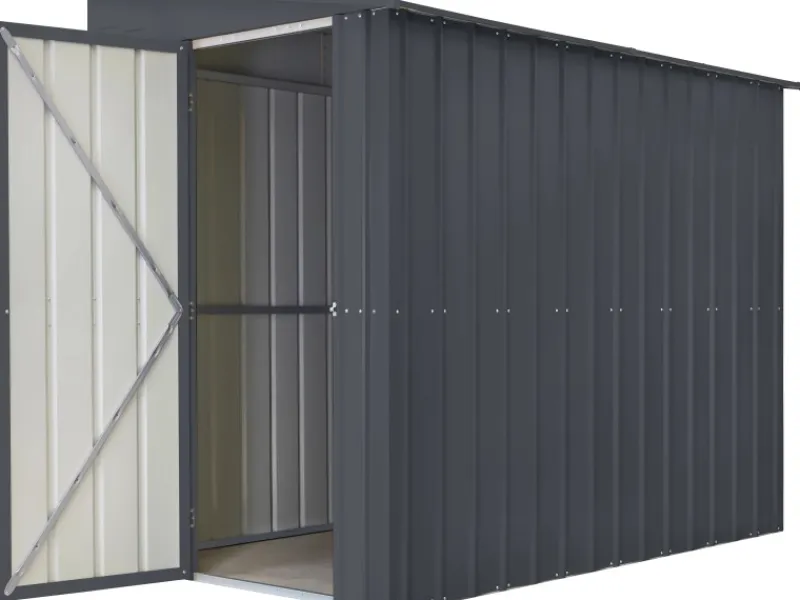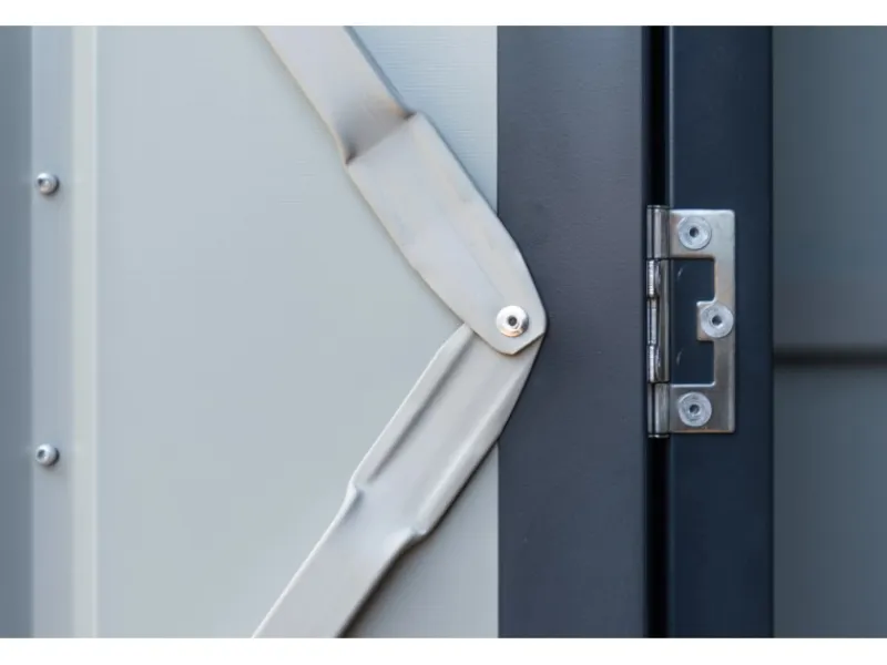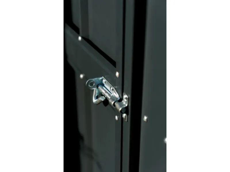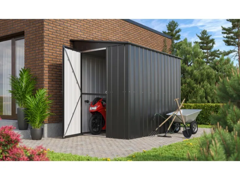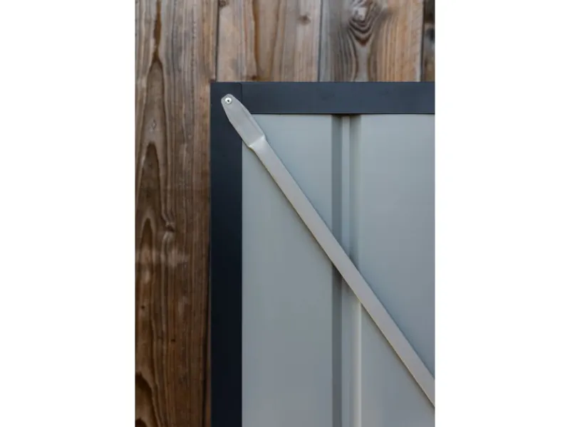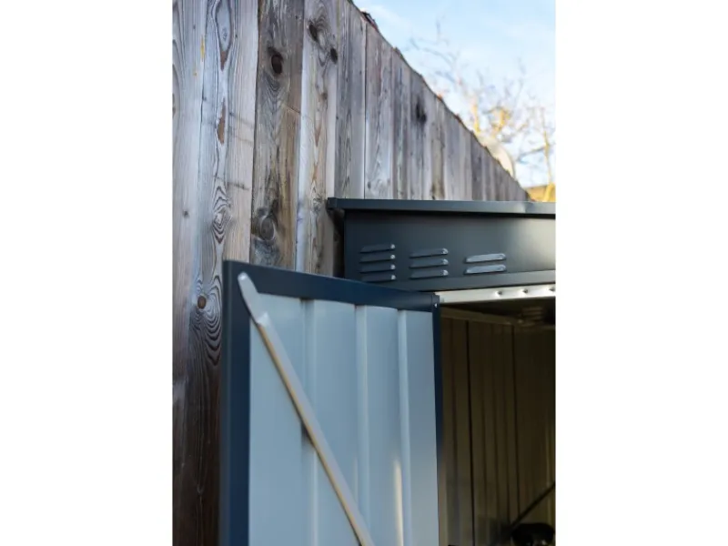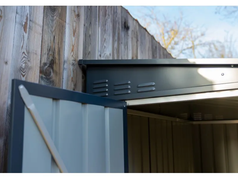 Das Gerätehaus aus Metall überzeugt durch sein ansprechendes Design und ist dabei in der Farbe Anthrazit gehalten.