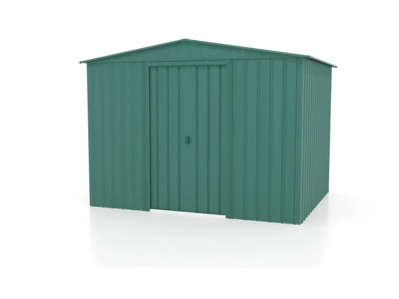 Das Metall-Gerätehaus überzeugt durch seine ansprechende Optik und ist dabei in der Farbe Jade gehalten.