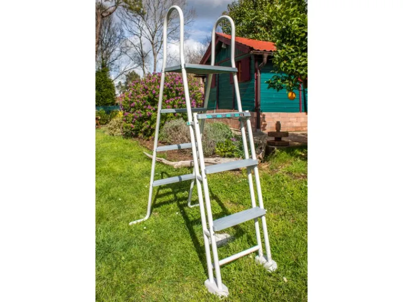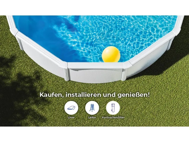 Die Struktur besteht aus weiß lackiertem, verzinktem Stahl, was dem Pool ein modernes und elegantes Aussehen verleiht. Die Montage erfolgt ohne Erdarbeiten, was eine einfache und schnelle Installation ermöglicht.
