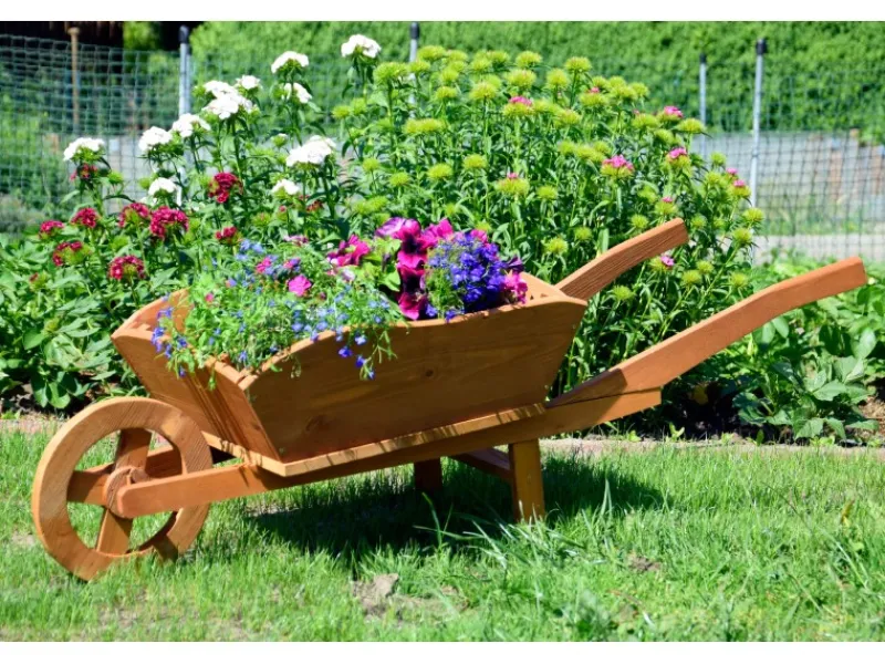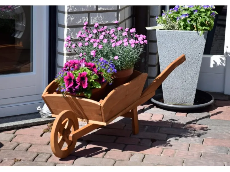 Die dekorative Blumenkarre aus imprägniertem Holz ist ideal für den Garten oder für den Balkon. Das Pflanzgefäss ist hauptsächlich aus massivem EU-Kiefernholz gefertigt. Es ist außerdem zur Bepflanzung mit Blumen und Gewächsen aller Art geeignet.