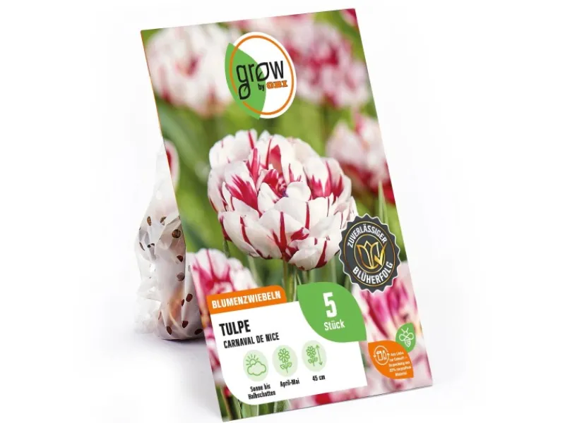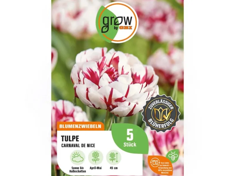Die GROW by OBI Tulpe „Carnaval de Nice“ (Tulipa double late) ist eine prächtige Frühlingsblume mit gefüllten, zweifarbigen Blüten in Weiß und Rosa. Diese Sorte verleiht deinem Garten im späten Frühling eine festliche und lebhafte Atmosphäre und ist bekannt für ihre üppigen Blütenköpfe. Mit ihrem farbenfrohen Erscheinungsbild ist die ‚Carnaval de Nice‘ Tulpe eine bemerkenswerte Bereicherung für deine Beete und Rabatten.