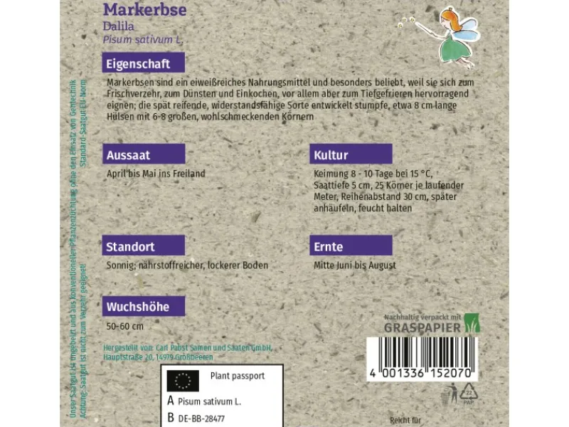 Markerbsen sind ein eiweißreiches Nahrungsmittel undbesonders beliebt, weil sie sich zum Frischverzehr, zum Dünsten und Einkochen, vor allem aber zum Tiefgefrieren hervorragend eignen, die spät reifende, widerstandsfähige Sorte entwickelt stumpfe, etwa 8 cm lange Hülsen mit 6-8 großen, wohlschmeckenden Körnern.Aussaat: April bis Mai ins Freiland.Kultur: Keimung 8-10 Tage bei 15 °C, Saattiefe 5 cm, 25 Körner je laufender Meter, Reihenabstand 30 cm, später anhäufeln, feucht halten.Standort: Sonnig, nährstoffreicher, lockerer Boden.Blüte/Ernte: Mitte Juni bis August.Inhalt: reicht für ca. 70 Pflanzen