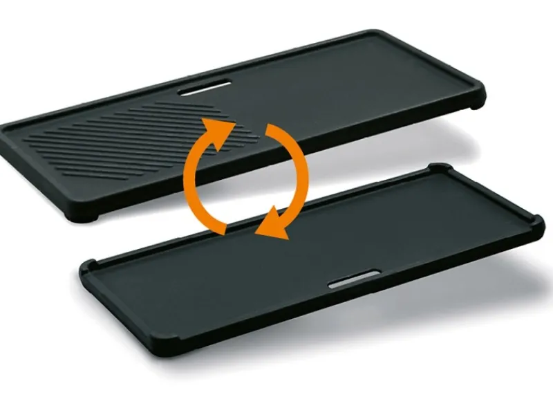 Die Gusseisenplatte ist besonders massiv und langlebig und zeichnet sich durch hervorragende Grillergebnisse aus. Mit einer gleichmäßigen Hitzeverteilung und einer langen Wärmespeicherung wird Ihr Fleisch schonend gegart und bleibt schön saftig. Die Grillplatte ist auch für empfindliche Speisen wie Garnelen, Grillgemüse oder Fischfilets bestens geeignet.