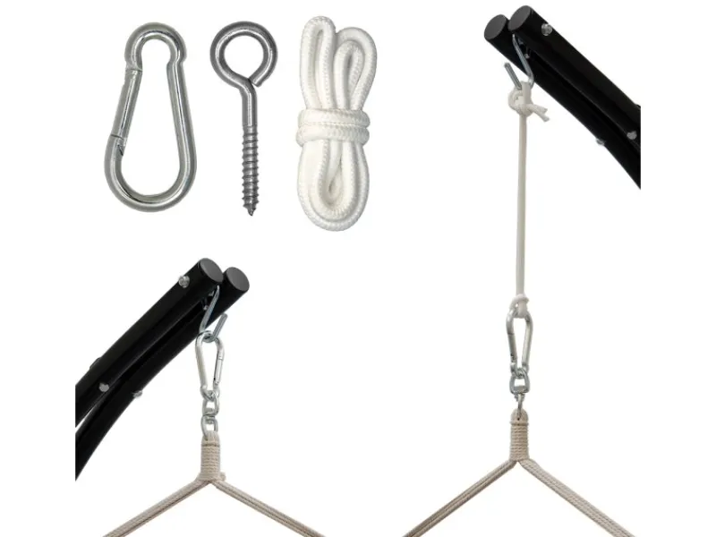 Bei einem Hängestuhlgestell hängen Sie nur den Karabinerhaken ein, verwenden optional das Befestigungsseil und verzichten auf die Ringschraube. Mit diesem Befestigungsset für Hängestühle werden Sie bestimmt Ihr Plätzchen für den Genuss des Hängestuhls finden.