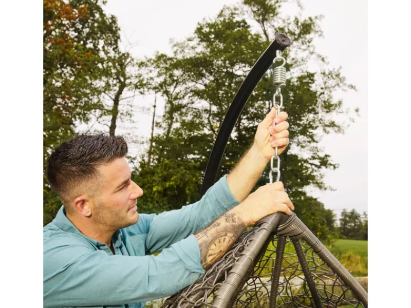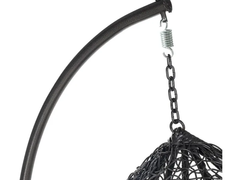 Der freischwingende Hängestuhl ist äußerst strapazierfähig und wetterbeständig. Der Korb aus Polyrattan in Grau ist UV- und witterungsbeständig. Das Hängesesselgestell aus Metall ist standsicher und extra stabil ausgeführt. Die gefederte Aufhängung sorgt für angenehmes Schaukeln mit leichten Schwingungen. Die Sitzkissen und Seitenkissen sind für noch mehr Komfort direkt im Lieferumfang enthalten. Die Bezüge aus Polyester sind waschbar.