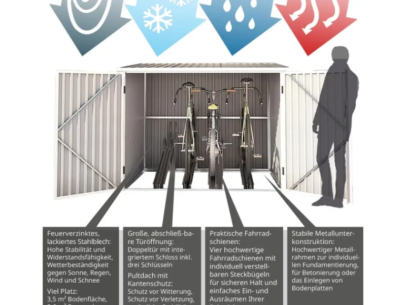 Sichere und wetterfeste Aufbewahrung von bis zu 4 Fahrrädern