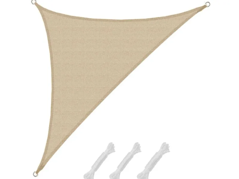Sonnensegel mit eingenähtem Gurt, D-Ringen aus Edelstahl und 3 robusten PE Seilen.