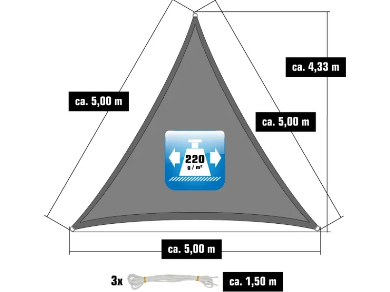 Sonnensegel mit eingenähtem Gurt, D-Ringen aus Edelstahl und 3 robusten PE Seilen.