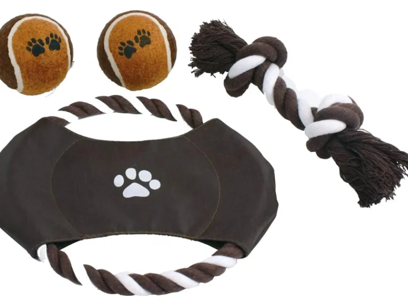 Das Heim Outdoor-Spielzeug-Set ist 4-teilig und besteht aus einem quietschendem Wurfring mit 20 cm Durchmesser, 2 Stück Tennisbällen mit 7 cm Durchmesser sowie einem 25 cm langem Spieltau aus Baumwolle.