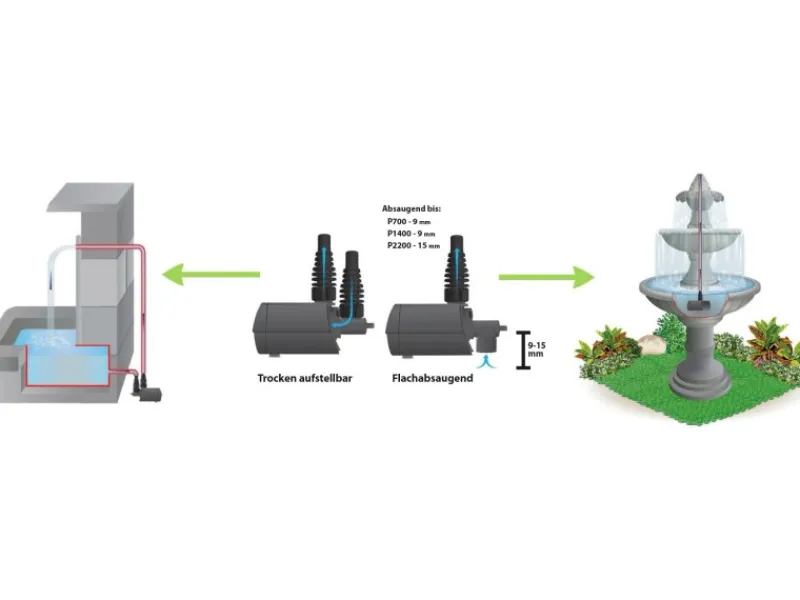 Teichpumpe Vielseitig einsetzbar, innen und außen, im Wasser oder trocken aufstellbar