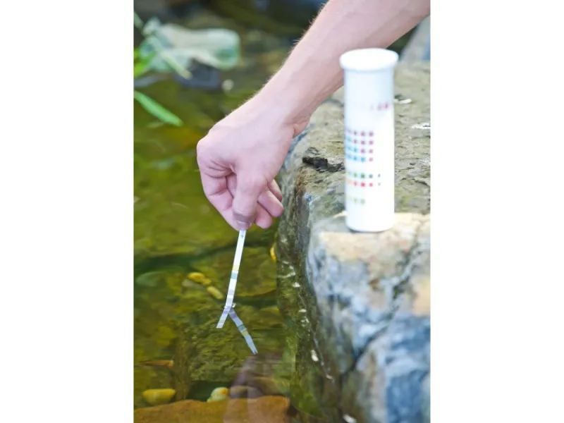 Das Heissner Schnell-Test-Set 6in1 beinhaltet Teststäbchen zur Überprüfung der 6 wichtigsten Teichwasserwerte (pH, GH, KH, CL, NO2, NO3) in nur einer Minute. Die Ergebnisse geben Aufschluss darüber, ob ein Wert auffällig ist und Korrekturen erfolgen sollten.