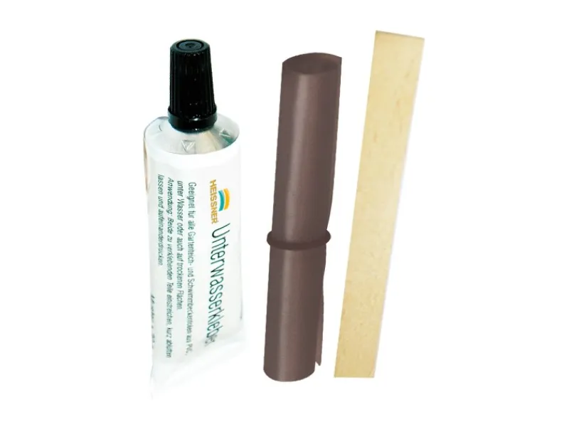 Das Heissner PVC Unterwasser-Folienkleber Reparatur-Set besteht aus einer 30 ml Tube Heissner PVC Unterwasser-Folienkleber und einem 30 cm x 9 cm Folienstück.