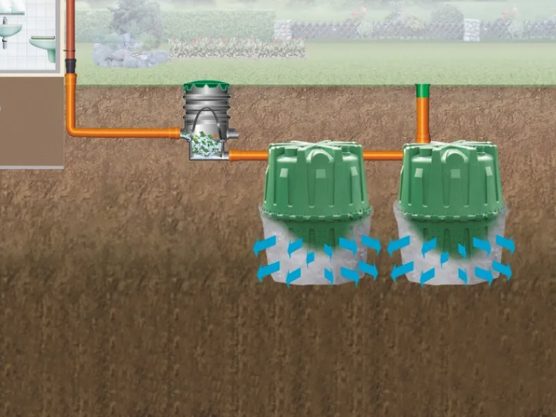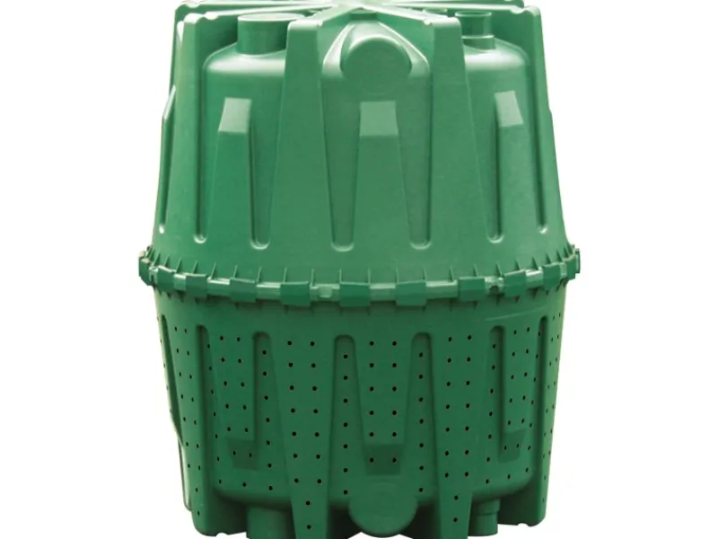 Der Sickerschacht besteht aus zwei Halbschalen und wird durch montagefreundliche Schnellverbinder innerhalb weniger Minuten montiert.