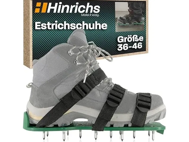 Flüssiger Bodenbelag, wie beispielsweise Estrich, will mit Sorgfalt und Bedacht behandelt werden. Da es sich bei Bodenbeschichtungsarbeiten nicht vermeiden lässt, über den frischen Belag zu gehen, bist du mit Estrich-Nagelschuhen von Hinrichs bestens beraten. Ruckzuck montiert sorgen 13 hochwertige, rostfreie Stahl-Spikes pro Sandale während des Gehens innerhalb der Verarbeitungszeit immer wieder für das Zusammenfließen des Belags. So hinterlässt du garantiert keine Fußabdrücke und das Resultat deiner Arbeit kann sich als schöne, ebene Bodenfläche sehen lassen.