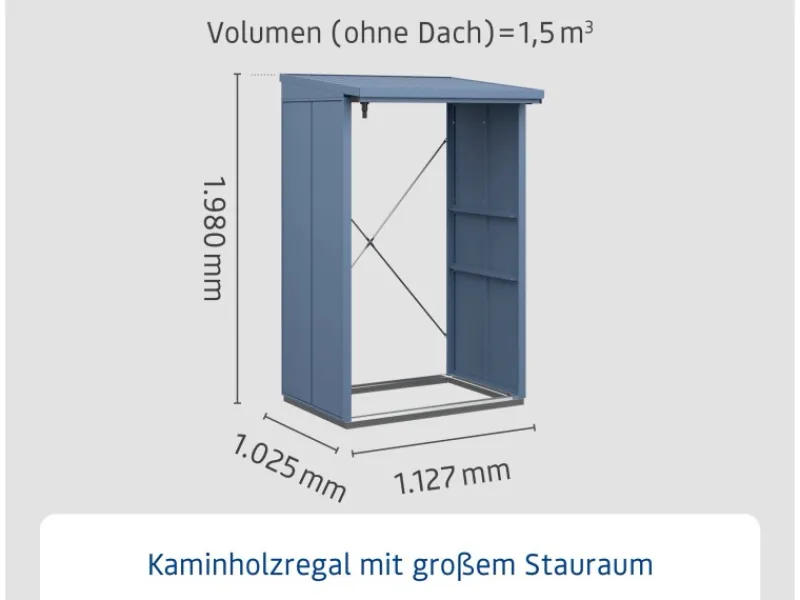 Das EcoStar Kaminholzregal Elegant-V Typ 1 aus Metall RAL5014 Taubenblau bietet genug Platz für die Lagerung von Kaminholz. Das praktische Aufbewahrungslager im flächig-modernen Motiv Elegant kann bis zu 3,5 Schüttraummeter Kaminholz aufnehmen. Der Alu-Bodenrahmen, der vor Rost schützt und für Stabilität sorgt, ist bereits im Preis enthalten.