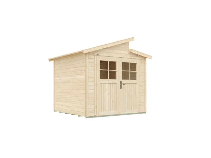 Das Gartenhaus ist im Steck- & Schraubsystem aus unbehandeltem Holz gefertigt. Durch die naturbelassene Oberfläche bleibt eine natürliche Optik mit Holzmaserung erhalten. Zum Schutz vor Witterungseinflüssen sollte die Oberfläche individuell mit einer Lackierung oder Lasierung veredelt werden. Für die Montage der Gartenlaube müssen Sie kein Profi-Handwerker sein. Dank des praktischen Steck-Schraubsystems kann die Montage problemlos durchgeführt werden und die einzelnen Teile lassen sich einfach verbinden. Das Gerätehaus verfügt über eine robuste Konstruktion, mit einer Wandstärke von 21 mm. Die maximalen Schneelast des Pultdachs liegt bei 76 kg/m. Die Dacheindeckung ist separat erhältlich.