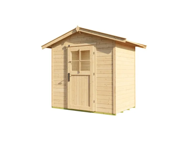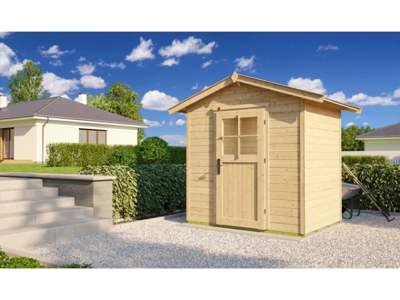 Das Gartenhaus ist im Steck- & Schraubsystem aus unbehandeltem Holz gefertigt. Durch die naturbelassene Oberfläche bleibt eine natürliche Optik mit Holzmaserung erhalten. Zum Schutz vor Witterungseinflüssen sollte die Oberfläche individuell mit einer Lackierung oder Lasierung veredelt werden. Für die Montage der Gartenlaube müssen Sie kein Profi-Handwerker sein. Dank des praktischen Steck-Schraubsystems kann die Montage problemlos durchgeführt werden und die einzelnen Teile lassen sich einfach verbinden. Das Gartenhaus verfügt über eine robuste Konstruktion, mit einer Wandstärke von 21 mm. Die maximalen Schneelast des Satteldachs liegt bei 76 kg/m. Die Dacheindeckung ist separat erhältlich.