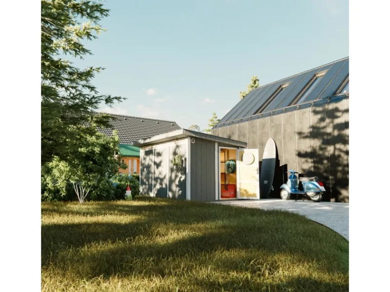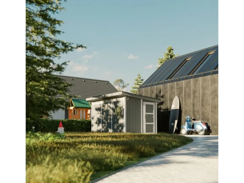 Das Holz-Gartenhaus überzeugt durch sein modernes Design. Es eignet sich besonders zur Aufbewahrung von Gegenständen.