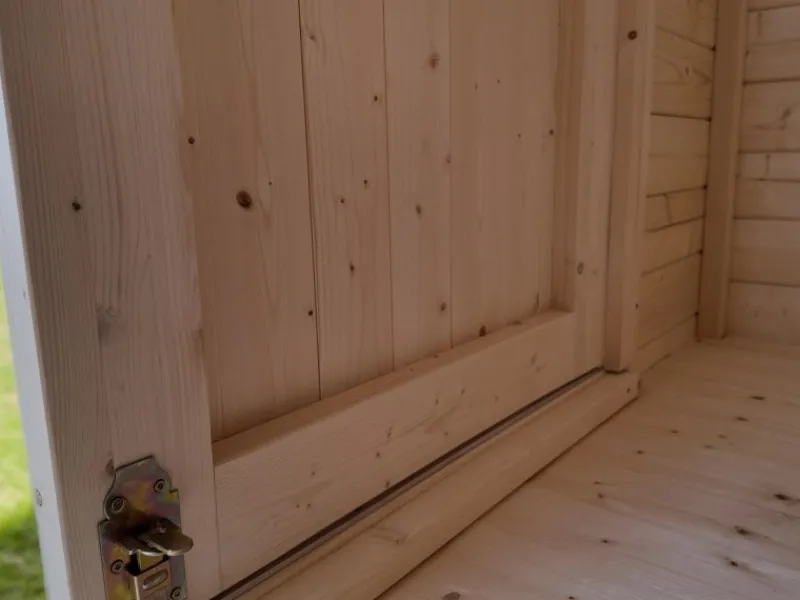 Die Gartenhütte ist mit einer Doppelflügeltür ausgestattet, die einen großzügigen Zugang bietet. So können Sie auch Ihre Gartenutensilien und Gartengeräte bestens im Holzhaus unterbringen. Neben dem Einsatz als Gerätehaus, eignet sich das Holzhaus einwandfrei zum Verweilen. Sollte es regnen, so können Sie es sich in der Holzhütte gemütlich machen und bei offener Tür die Natur genießen.