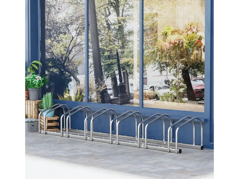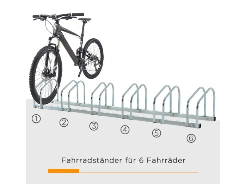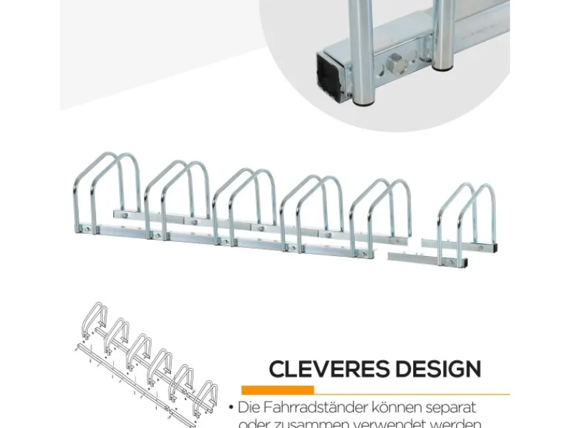 Unser praktischer Mehrfachständer von HOMCOM bietet einen sicheren Stellplatz für bis zu 6 Fahrräder. Die langlebige Stahlkonstruktion ist mit einer wetterfesten Lackierung versehen und eignet sich ideal für den dauerhaften Einsatz im Außenbereich. Kinderräder, Mountainbikes, Rennräder oder City Bikes mit einer Reifenbreite von bis zu 65 mm können sicher abgestellt werden. Zudem kann der Fahrradständer bequem mit einem identischen Ständer kombiniert oder einfach als Einzelständer genutzt werden.