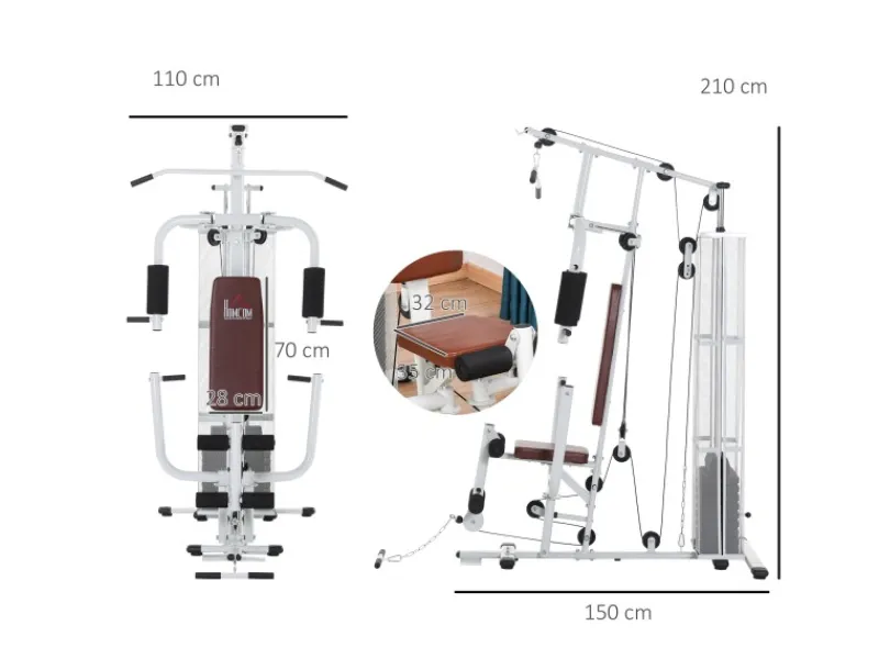 HOMCOM Fitnessgeräte|Kraftstation mit Stahlnetz Latzug Metall Kunstleder Weiß 150x110x210cm