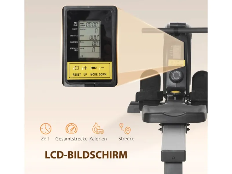 – LCD-Monitor des Rudergeräts zeichnet Ihre Trainingszeit, Distanz, Kalorien, Herz und Herzfrequenz auf