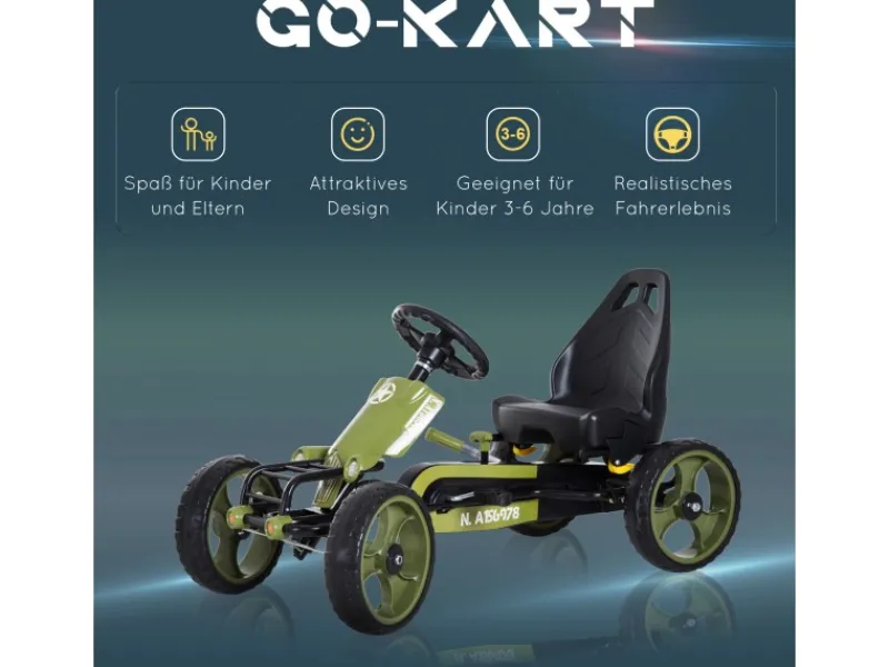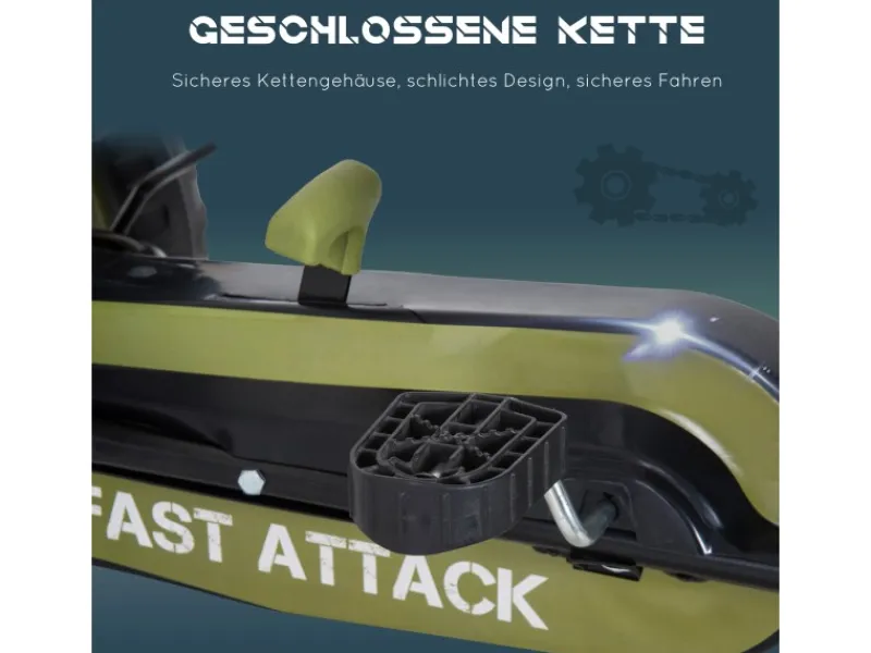 Bei unserem Kinder Gokart von HOMCOM wird Fahrspaß großgeschrieben. Das taffe Armee-Design Ihres Kinderfahrzeugs macht Lust auf Draußen, so ist stundenlanger Fahr- und Spielspaß garantiert. Der Kettenantrieb ist gefahrlos unter einem Schutzblech verborgen, gebremst wird mittels Handbremse. So kommt Ihr Kind auch bei voller Fahrt sicher zum Stehen. Er ist flexibel nach vorne oder hinten einstellbar, sodass Ihre Nachwuchsrennfahrer immer bequem sitzen.