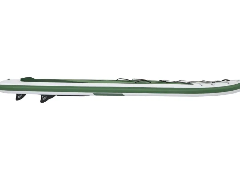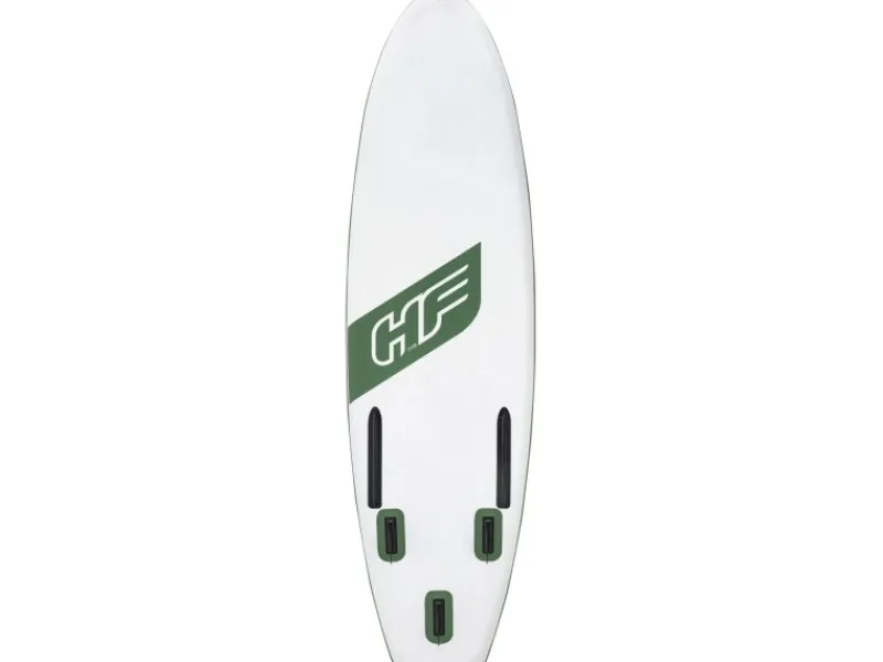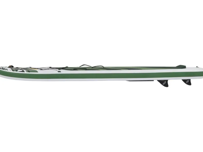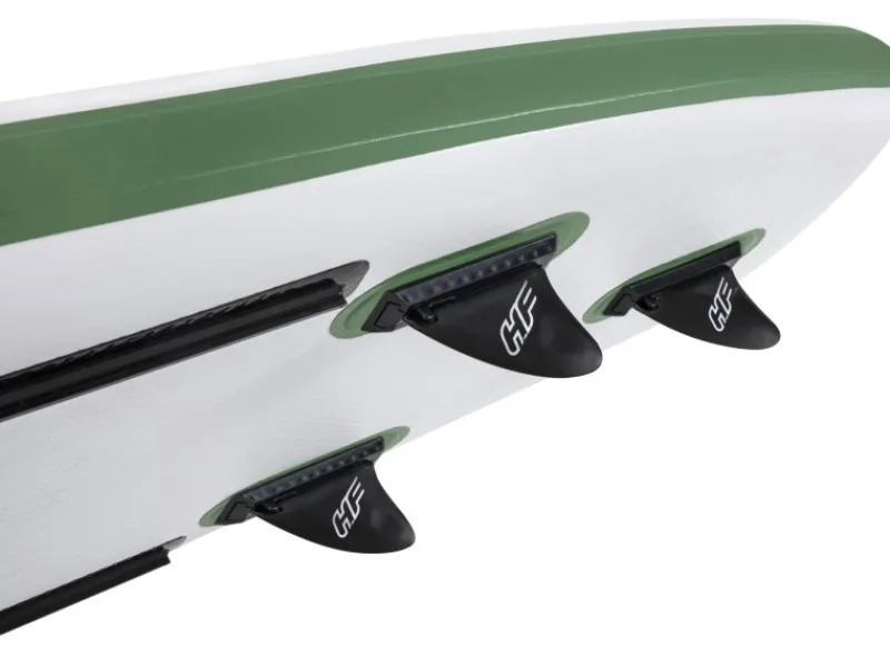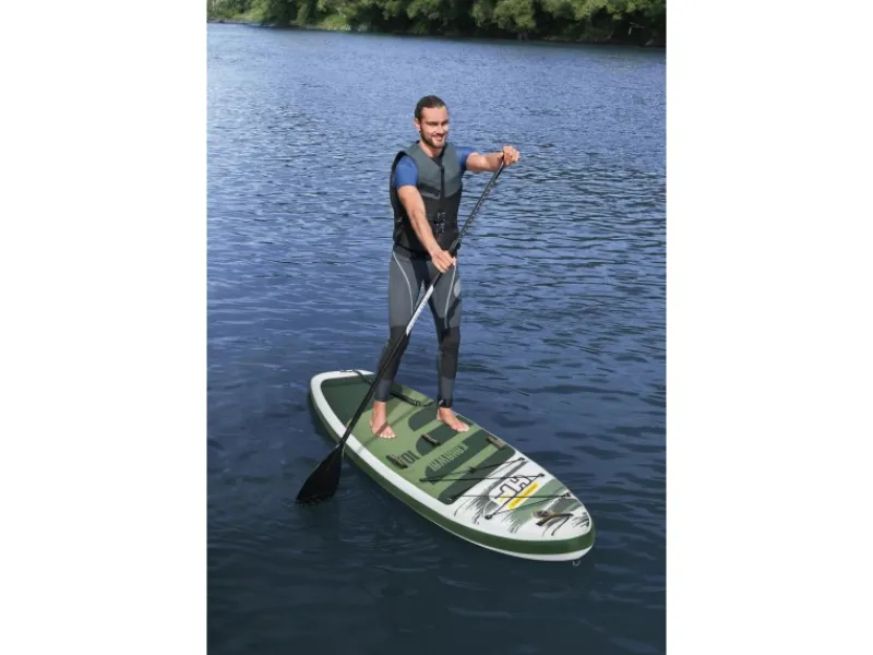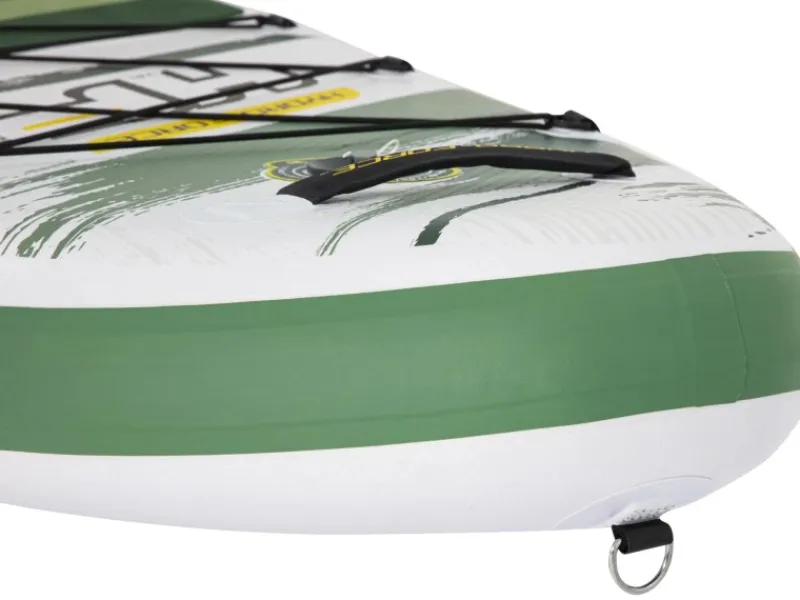 Das SUP bietet ein großflächiges Antirutsch-Pad, das Ihnen die Balance erleichtert, und es verfügt über mehrere Griffe zum Festhalten, damit Sie Ihr Board in jeder Situation ziehen können. Drei in das Board eingebaute Finnen für den Vortrieb gewährleisten Manövrierbarkeit und Balance. Das Elastikband des SUPs bietet sicheren Stauraum für persönliche Gegenstände.