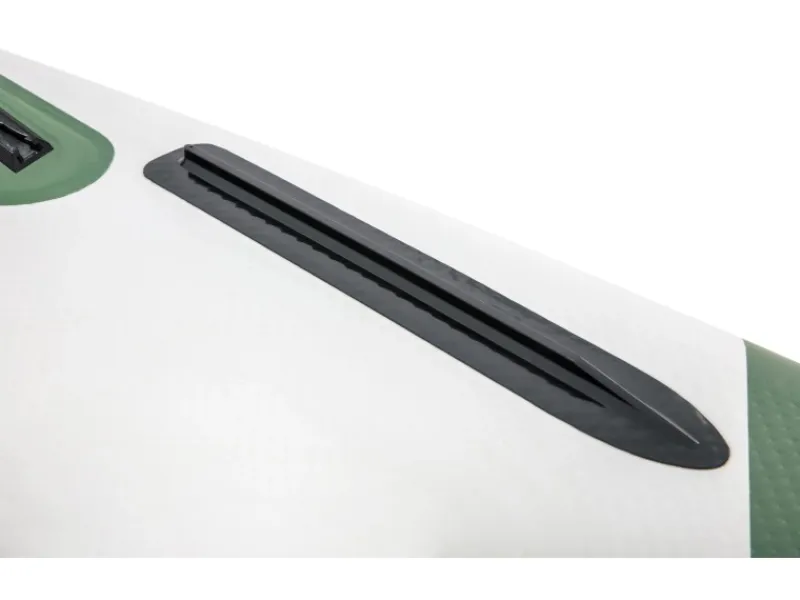 Das Board besteht aus Dropstitch-Material, bei dem Tausende Fasern die Ober- und Unterseite des Boards verbinden. Dadurch ist es extrem fest und stabil, fast wie ein Hardboard, gleichzeitig ist es leicht, bequem tragbar und einfach zu lagern.
