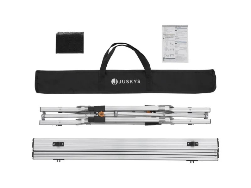 Das einhängbare Netz unter der Tischplatte dient als zusätzliche Ablage. Nach Gebrauch ist der Klapptisch platzsparend faltbar und in der Stofftasche zu verstauen.