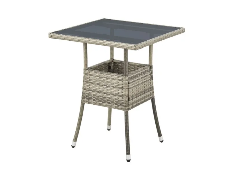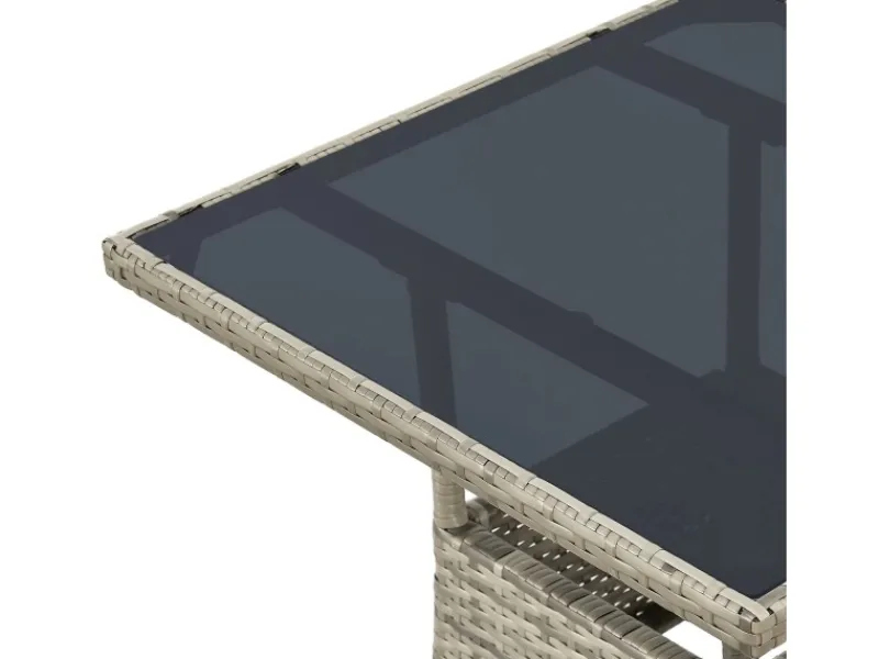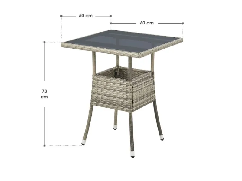 Aus wetterbeständigem Polyrattan, mit einem pulverbeschichteten Stahl-Gestell und einer Platte aus Sicherheitsglas, ist der Tisch widerstandsfähig und langlebig.