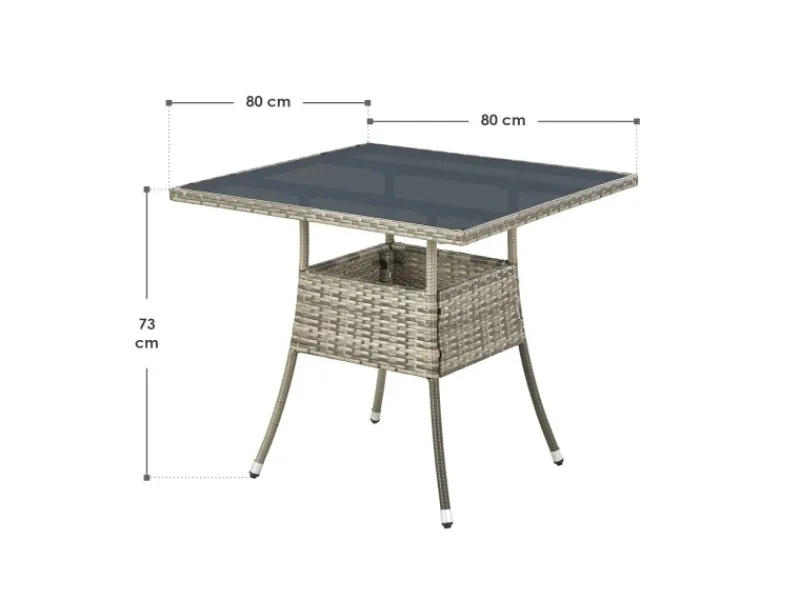 Aus wetterbeständigem Polyrattan, mit einem pulverbeschichteten Stahl-Gestell und einer Platte aus Sicherheitsglas, ist der Tisch widerstandsfähig und langlebig.