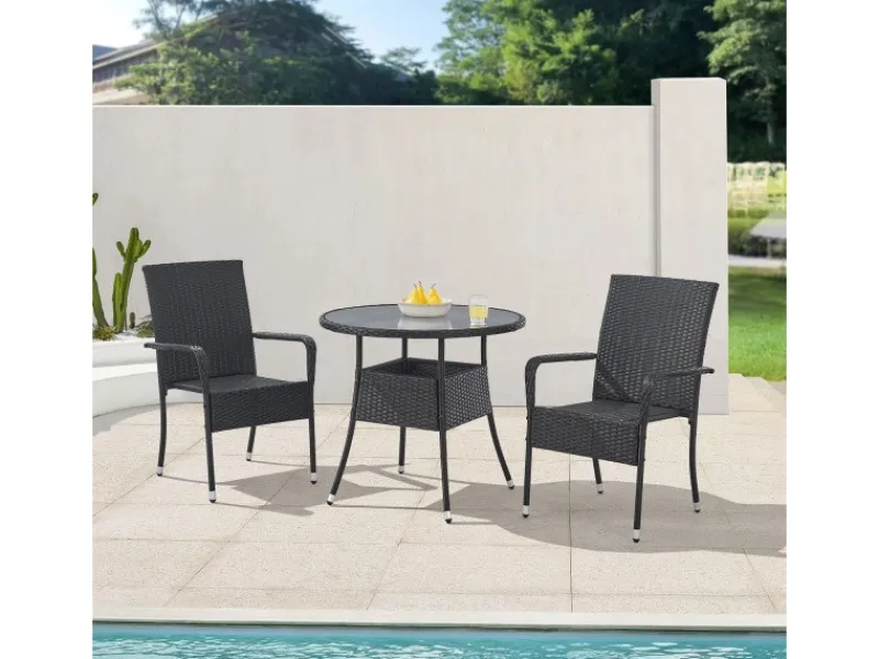 Aus wetterbeständigem Polyrattan, mit einem pulverbeschichteten Stahl-Gestell und einer Platte aus Sicherheitsglas, ist der Tisch widerstandsfähig und langlebig.
