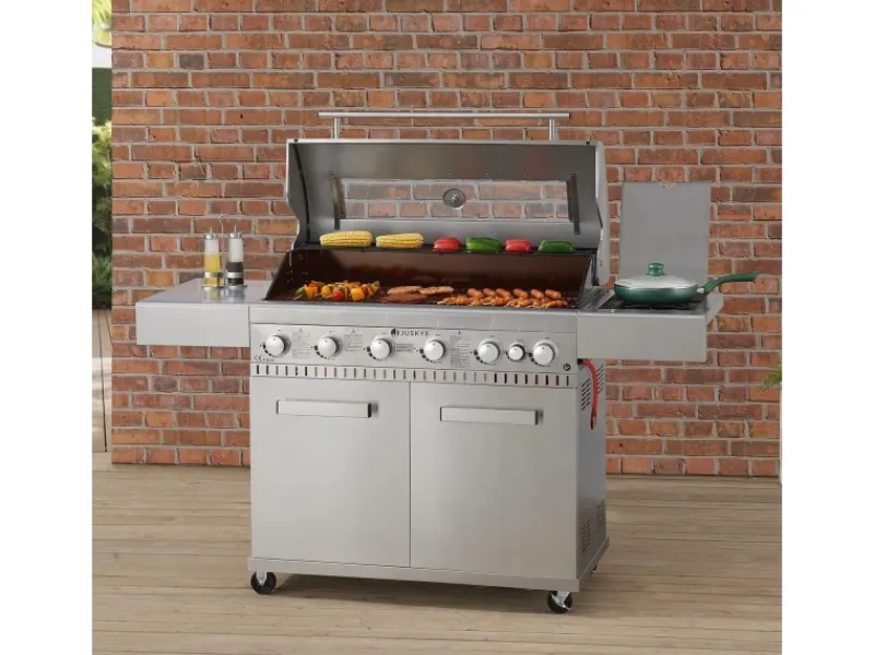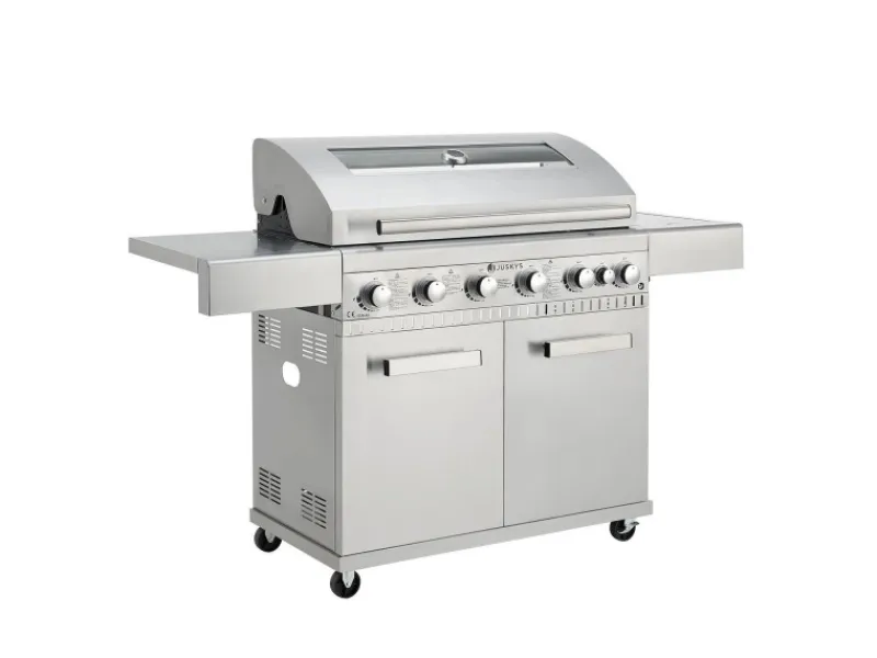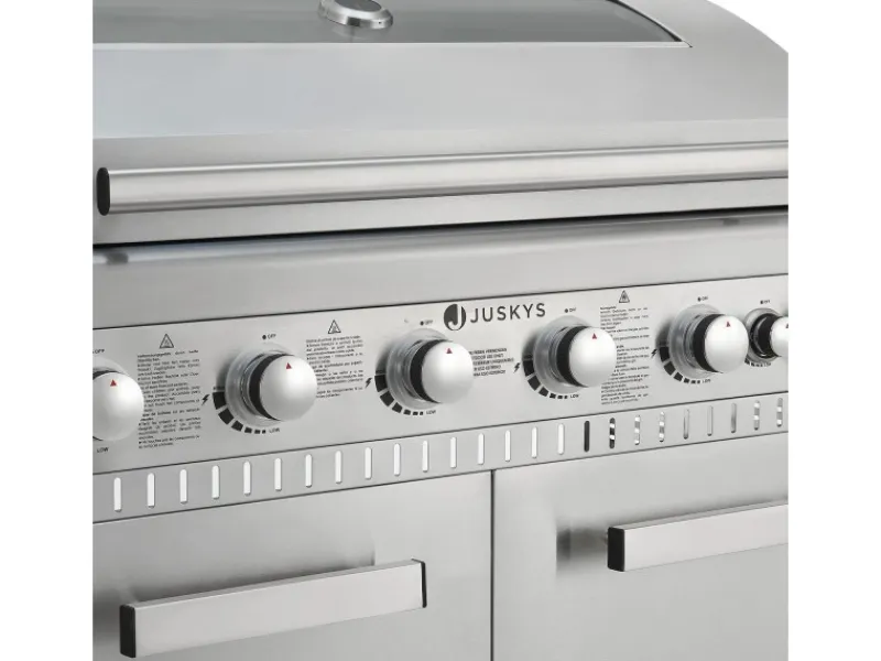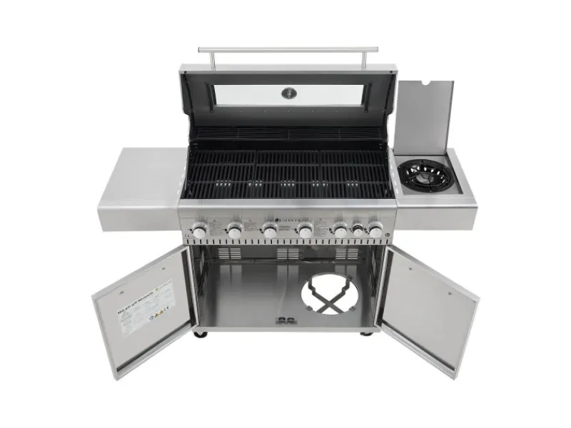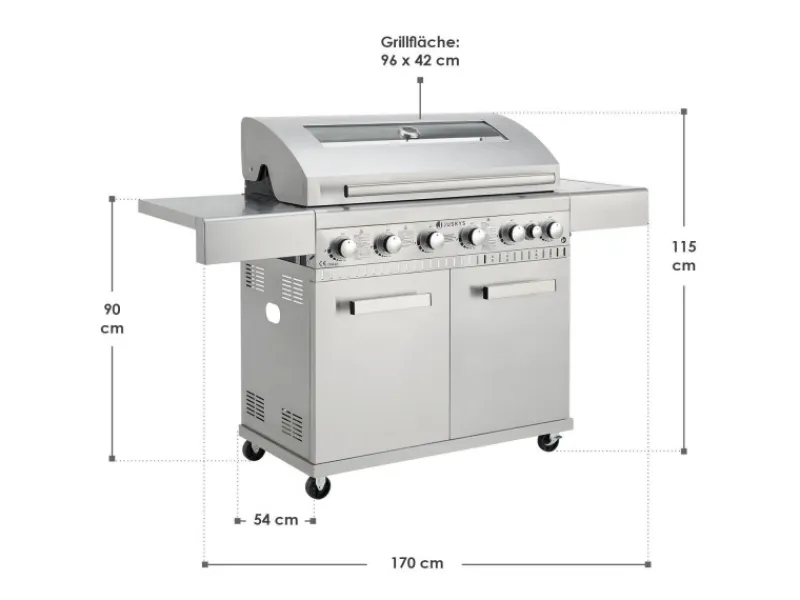 – Ausstattung: Piezo-Zündung, Warmhalterost, 2 seitliche Arbeitsflächen, 6 Brenner, 1 Seitenbrenner, LED-Drehknöpfe (Batterien nicht enthalten)