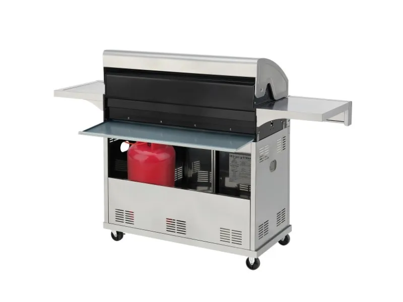 Zwei seitliche Arbeitsflächen bieten Platz zum Schneiden, Vorbereiten und Aufbewahren von Grillgut, während das breite Sichtfenster im Deckel immer einen Blick auf den Grillbereich bietet. Nebenbei lagern Sie die Gasflasche und anderes Equipment platzsparend im Unterschrank.