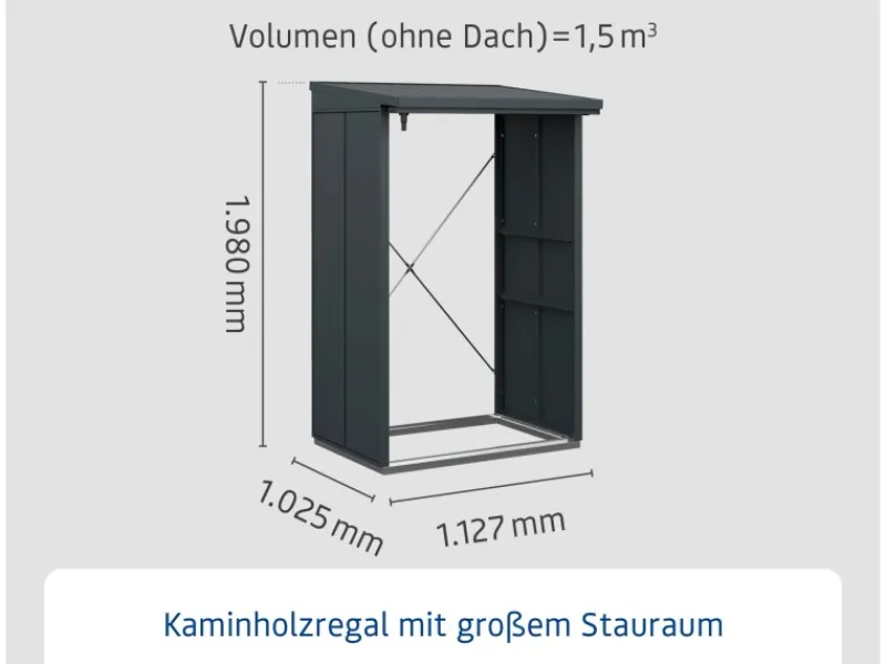 Das EcoStar Kaminholzregal Elegant-V Typ 1 aus Metall RAL7016 Anthrazitgrau bietet genug Platz für die Lagerung von Kaminholz. Das praktische Aufbewahrungslager im flächig-modernen Motiv Elegant kann bis zu 3,5 Schüttraummeter Kaminholz aufnehmen. Der Alu-Bodenrahmen, der vor Rost schützt und für Stabilität sorgt, ist bereits im Preis enthalten.
