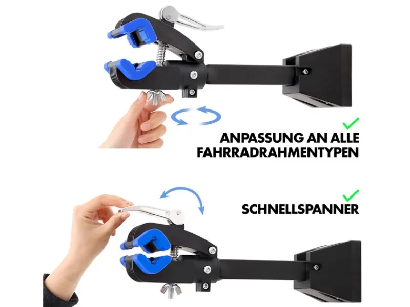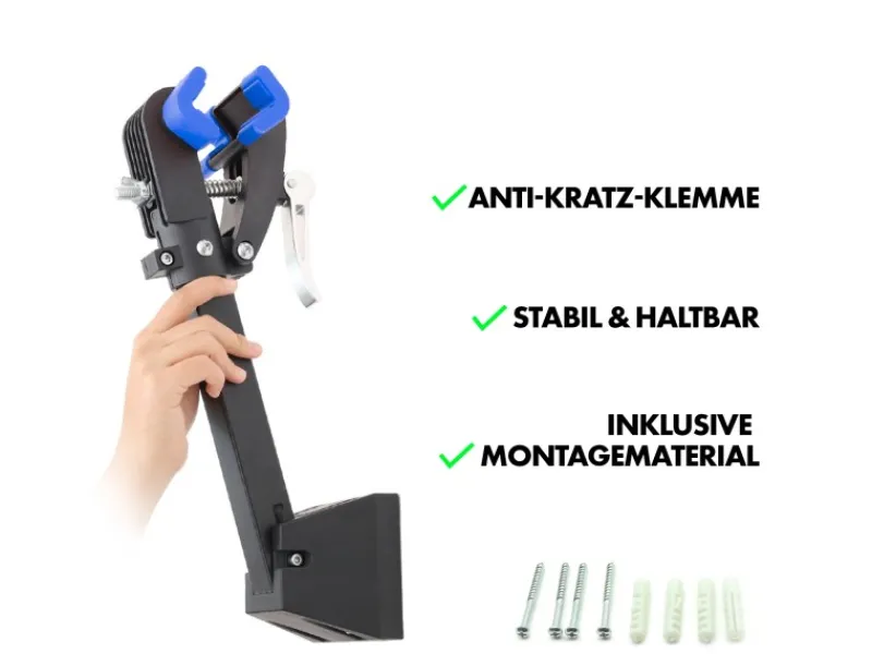 Die Halterung ist bis zu 20 kg belastbar und eignet sich somit für die meisten Fahrradtypen, von leichten Rennrädern bis hin zu robusten Mountainbikes. Die kratzfesten Gummipolster schützen den Rahmen Ihres Fahrrads zuverlässig vor Kratzern und Abnutzung, sodass Sie Ihr Fahrrad sicher und schonend aufbewahren können.