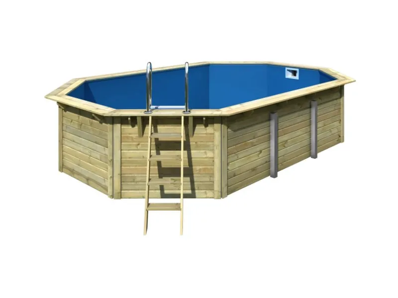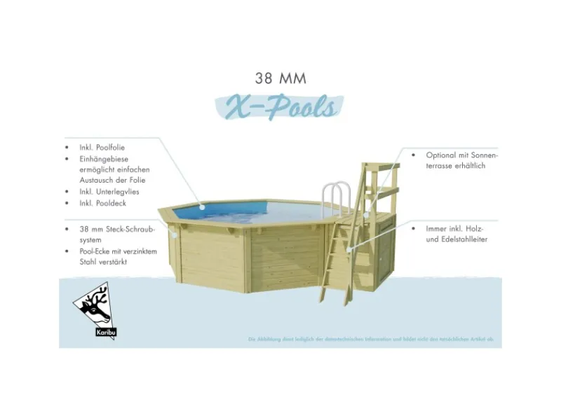 Der Massivholzpool aus 38 mm starken kesseldruckimprägnierten und damit witterungsbeständigen Blockbohlen bietet Ihnen Sommerfrische im eigenen Garten. Dank einer Wassertiefe von 111 cm und einem Volumen von 19,15 m³ bietet er ausreichend Platz für jede Anforderung. Die Diagonale von 632,5 cm und ein Innenmaß von (B x T) 558 cm x 347 cm stehen für sich. Die Lieferung erfolgt inkl. einer 0,6 mm starken blauen Poolfolie, in eine hochwertige Einhängebiese eingeklipst wird. Das reduziert das Risiko von Falten in der Folie enorm und macht einen evtl. notwendigen Folientausch einfach. Dies ist ein großer Vorteil zu herkömmlich vernagelten Poolfolien. Das Schutzvlies unterhalb des Pools ist 400 g/m² stark. Die Lieferung erfolgt stets mit einer Einhängeleiter aus hochwertigem Edelstahl. Das Pooldeck ist 26 mm dick und bietet einen schönen Abschluss an der Oberkante.