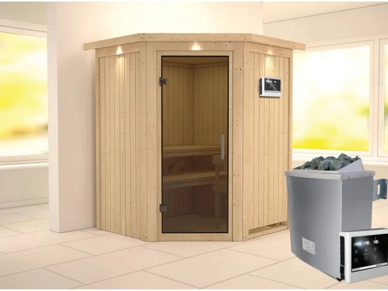 Karibu Outdoor Whirlpools|Sauna-Set Lyra inkl. Ofen 9 kW mit ext. Steuerung, Dachkranz, Tür Graphit