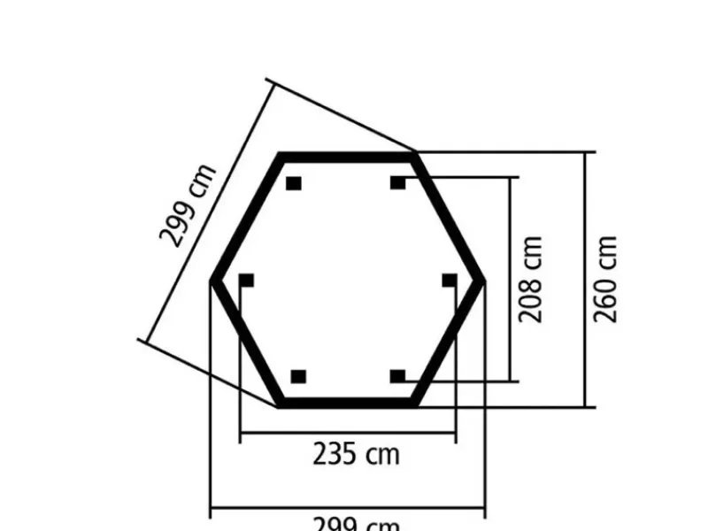 Der sechseckige Pavillon Alicante hat ein Außenmaß von 235 cm x 208 cm und ein Dachstandmaß von 299 cm x 260 cm. Die Seitenhöhe beträgt 199 cm, der First misst 280 cm. Das formschöne Walmdach wird von 6 Pfosten gestützt, die jeweils 9 cm x 9 cm stark sind. Die Pfosten und weiteren Sparren Querverbinder sind kesseldruckimprägniert und somit gegen Witterungseinflüsse bestens geschützt. Wir empfehlen die Verwendung von passenden H-Ankern mit einer Länge von 60 cm für die Befestigung im Untergrund.
