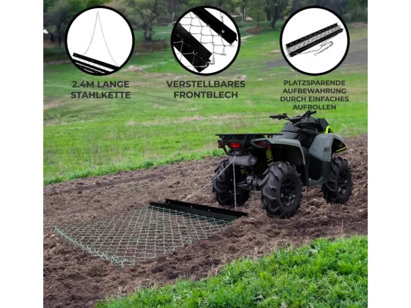 Holen Sie das Beste aus Ihrem Ackerland heraus und erleben Sie die volle Kraft der Präzision und Effizienz mit unserer hochmodernen Wiesenegge. Dieser kraftvolle landwirtschaftliche Begleiter wurde akribisch entwickelt, um Ihre Anbauprozesse zu optimieren. Mit einer großzügigen Eggenfläche von 1,5m x 1,2m bewältigt dieses Werkzeug spielend große Flächen und spart Ihnen wertvolle Zeit und Energie. Hergestellt aus robustem Q235-Stahlmaterial mit einer Stärke von 3 mm trotzt unsere Wiesenegge den anspruchsvollsten Feldbedingungen. Die 60mm x 60mm Maschengröße sorgt für eine gründliche Belüftung des Bodens und fördert das gesunde Wachstum Ihrer Pflanzen. Eine ihrer beeindruckenden Eigenschaften ist das verstellbare Frontblech, das es ermöglicht, zusätzliches Gewicht wie Ziegel oder Blöcke hinzuzufügen. Dadurch passt sich die Egge flexibel an verschiedene Bodenarten und Anforderungen an. Mit einer 2,4 Meter langen Kette und zuverlässigen Karabinerhaken lässt sich diese Wiesenegge mühelos an Traktoren oder ATVs befestigen. Sie gewährleistet nicht nur ein gleichmäßiges und präzises Eggen, sondern auch eine sichere Verbindung, auf die Sie sich verlassen können. So können Sie sich ganz auf Ihre Arbeit konzentrieren, ohne Unterbrechungen. Diese Wiesenegge besticht durch ihre Vielseitigkeit und Benutzerfreundlichkeit. Sie lockert den Boden, entfernt Unkraut und bereitet das Saatbeet optimal vor. Nach getaner Arbeit lässt sich die Eggenmatte mühelos aufrollen und platzsparend lagern. Ihr durchdachtes Design sorgt dafür, dass Ihr Arbeitsbereich immer ordentlich und aufgeräumt bleibt und stellt die Praktikabilität in den Vordergrund. Verwandeln Sie Ihre Felder mit der modernen Effizienz unserer Ketten-Egge in blühende Böden und gewährleisten Sie so ein nahtloses und produktives landwirtschaftliches Abenteuer. Produktmerkmale: * Große Abdeckungfläche von 1,2 x 1,5m * Verstellbarer Vorderträger * Hochwertiger Q235 Stahl * 2,4m Kette mit Karabinerhaken * Platzsparend aufrollbar Spezifikationen: * Farbe: Silber * Gewicht: 13,3kg * Material: Q235 Stahl * Höhe: 9cm / 0,09m * Breite: 120cm / 1,2m * Länge: 150cm / 1,5m * Dicke des Stahls: 3mm * Maschenweite: 60mm x 60mm * Kettenlänge: 240cm / 2,4m Im Lieferumfang enthalten: * 1 x Robuste Wiesenegge * 1 x Starke 2,4m Kette * 2 x Sichere Karabinerhaken * 1 x Befestigungsmaterial-Set